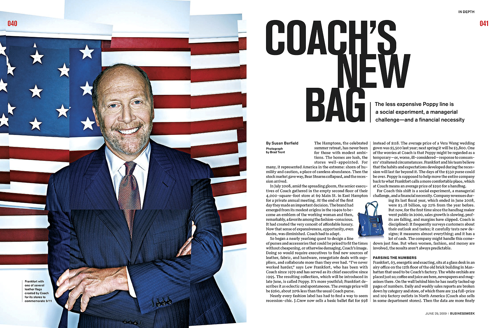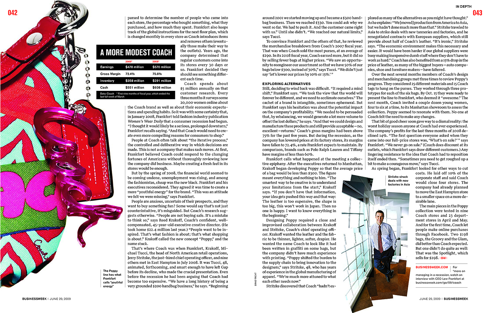 For the second week in a row, I have a feature in BusinessWeek, a story on the new marketing strategy at Coach, featuring Lew Frankfort, the CEO, and Jerry Stritzke, the COO. The story looks great and the best thing was that I got to break out the mosaic-tiling technique I’ve been doing lately…..