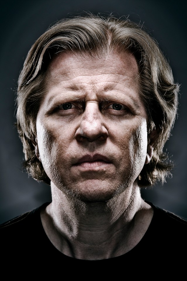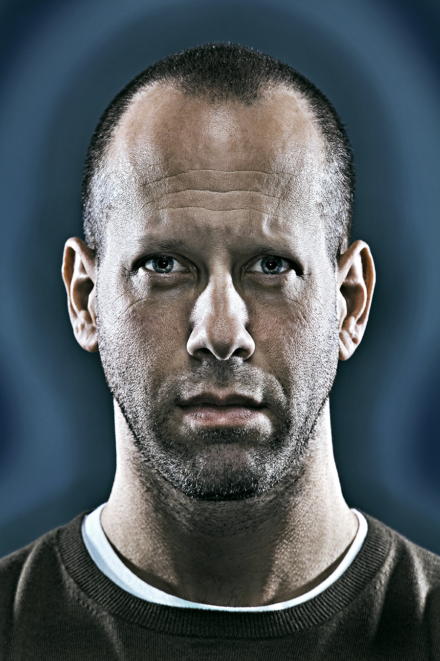 For this shot I wanted to keep things simple and just focus on his expressions, so I kept the lighting pretty open with a gridded beauty dish up high above his face, a couple of skim lights on either side of him and another ringlight adding not only fill, but a nice reflection highlight on the wood that separated him from the background. But the real beauty of the shot was the unexpected caught moment of him just enjoying his coffee and having a laugh before we actually got under way. I finished things off with that tight portrait at the top of the page, but the magazine went straight to Gordon and his coffee cup…