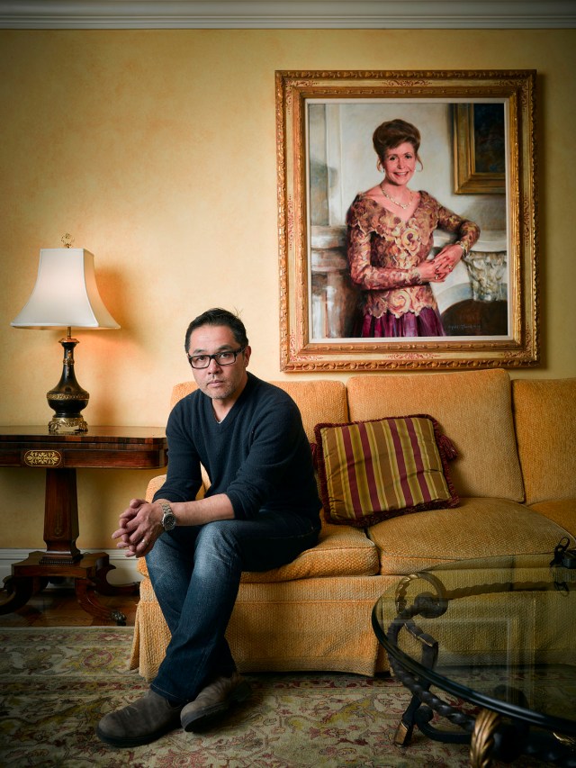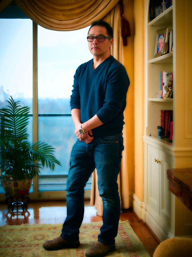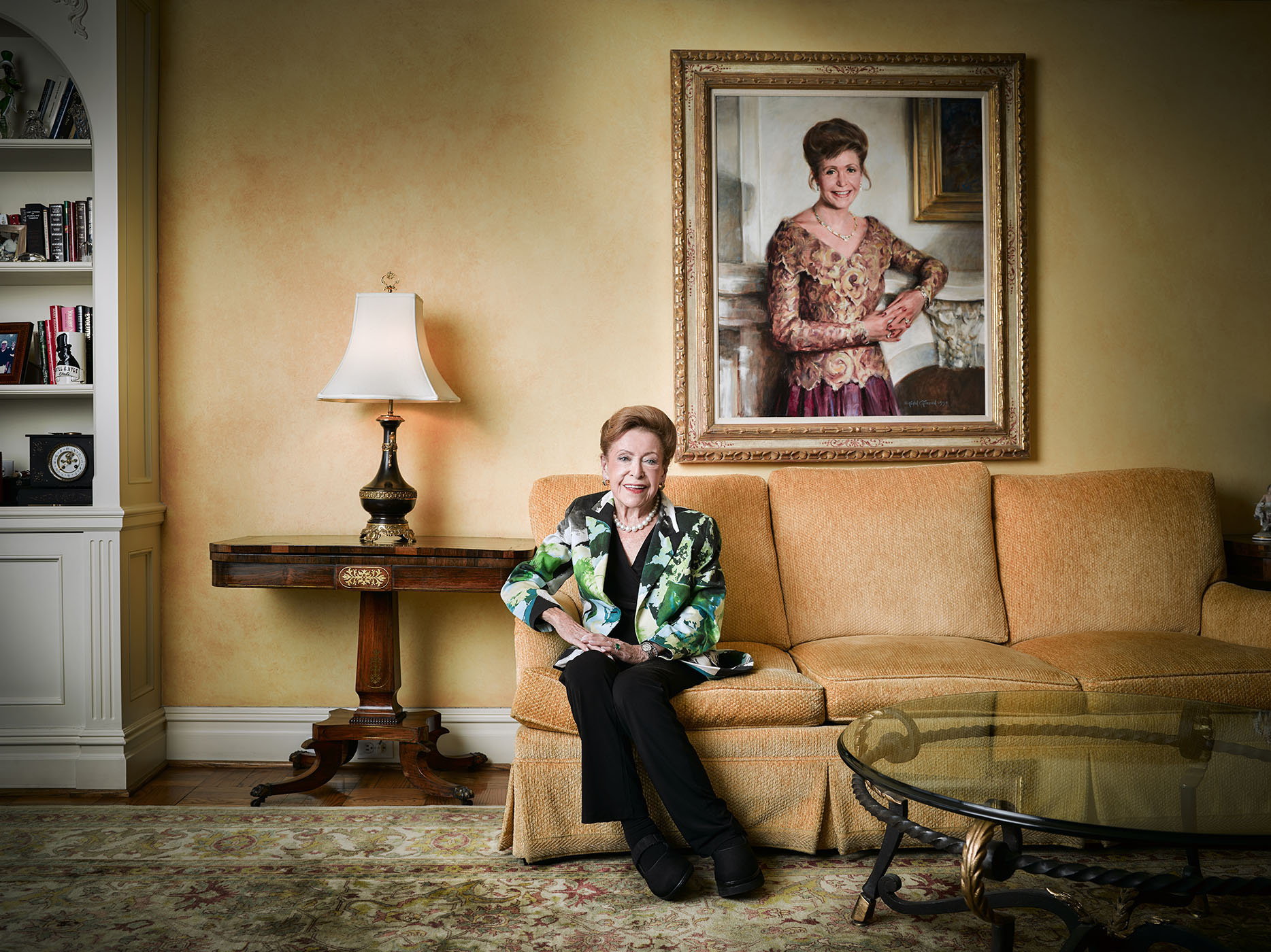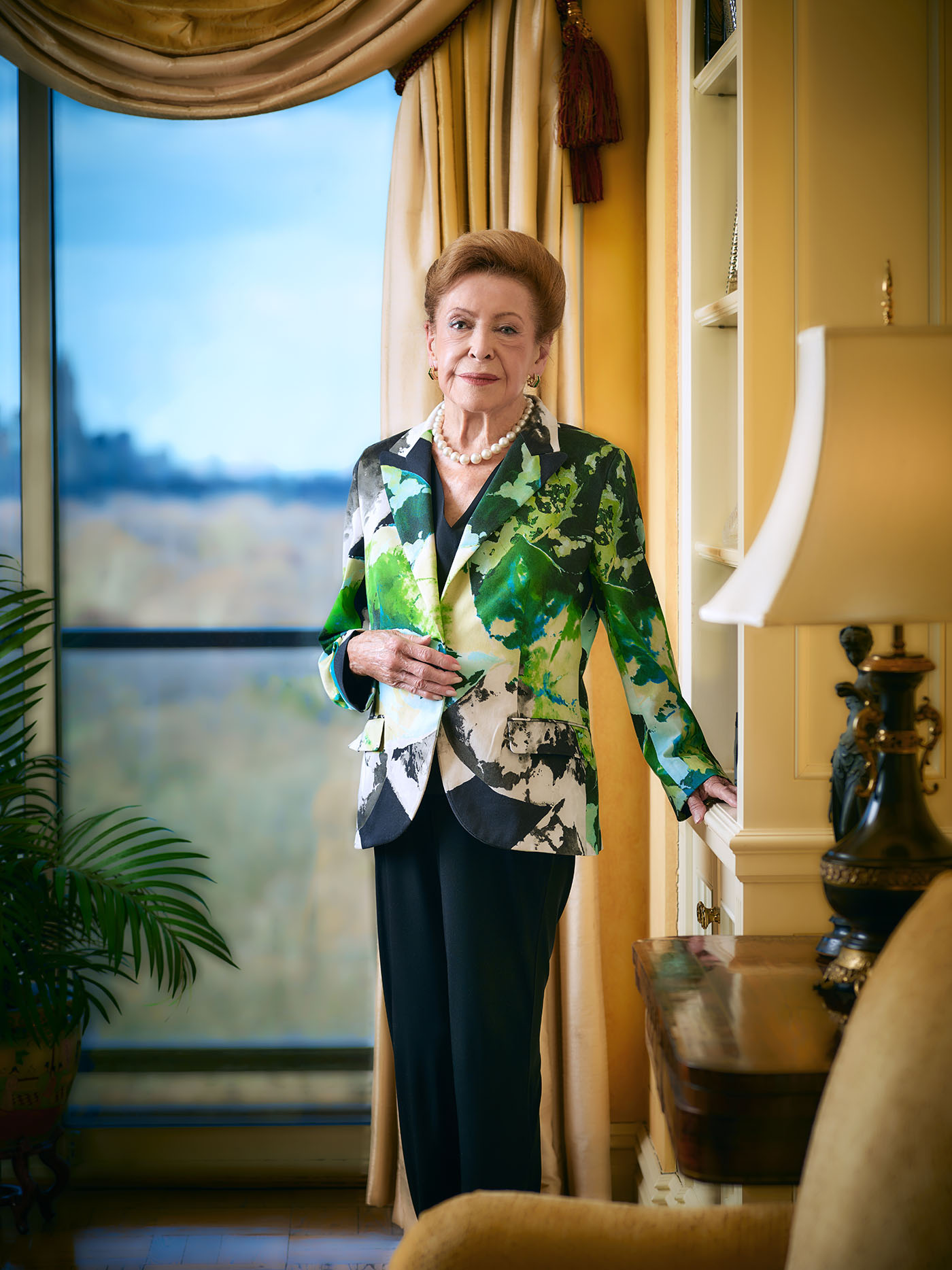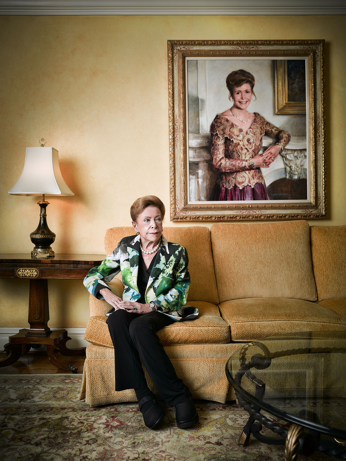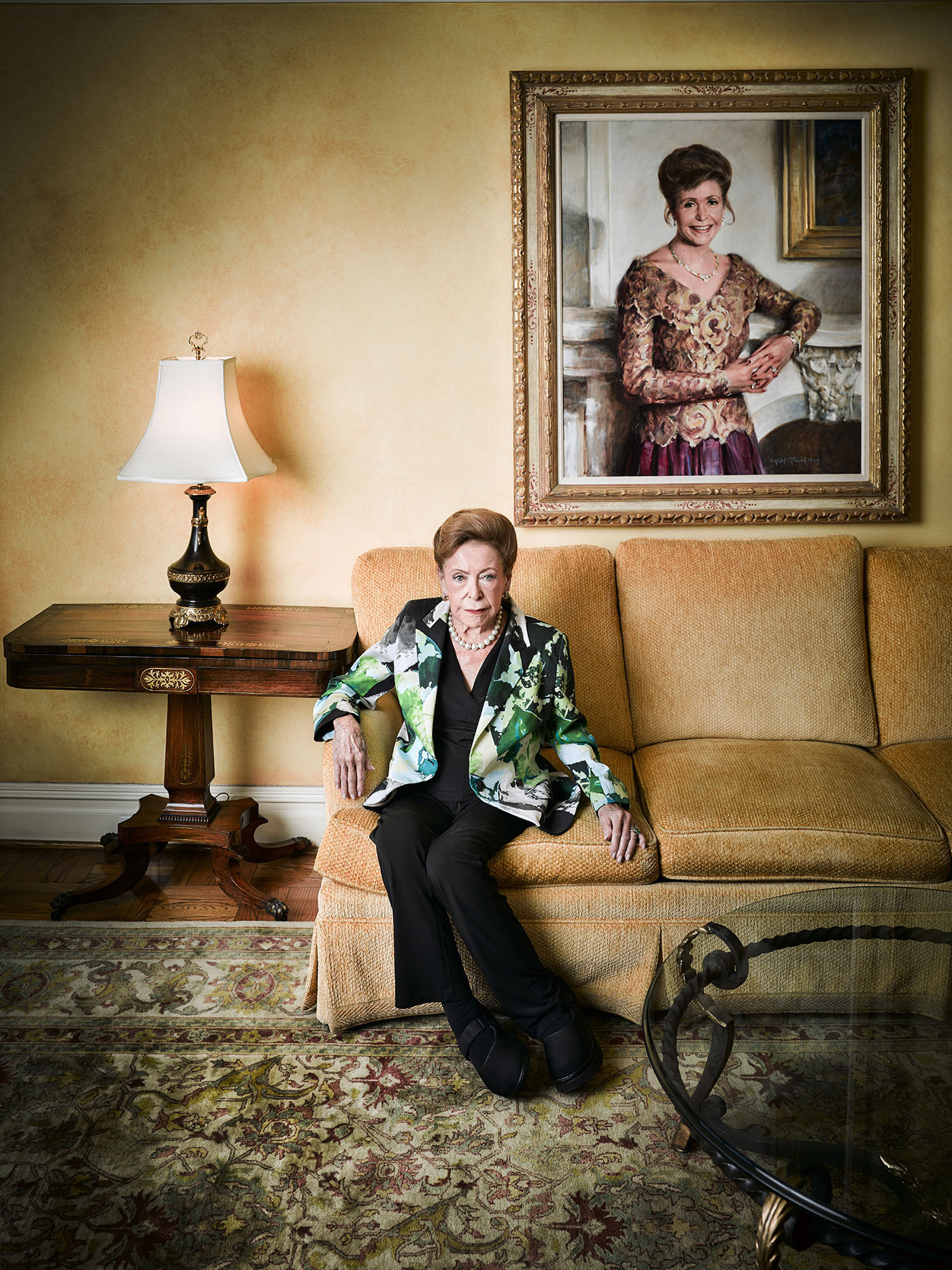 When I described the apartment as a pied-à-terre, I wasn’t kidding. Her main residence is an estate in New Jersey, but the Central Park apartment is just a small one-bedroom she uses in the city, but it was impeccably designed and offered us a few options. We started with a simple setup in front of a painting her children commissioned of their mother 30 years earlier. And for the lighting, it was equally simple…just a 7′ umbrella with a black Gobo to cut the light on the upper corner…