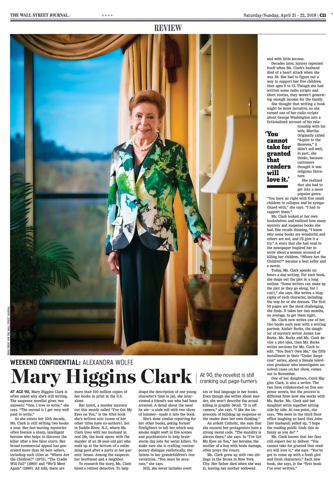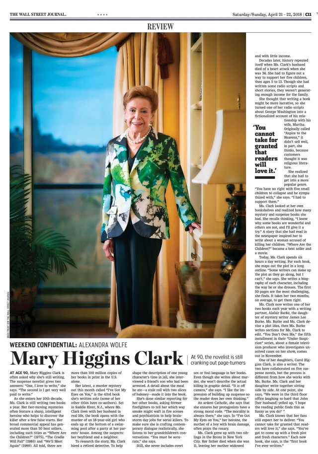 I recently got to spend an afternoon overlooking Central Park in the pied-à-terre of iconic author Mary Higgins Clark. She had just published her 37th novel…which, as usual, entered at the Bestsellers List at #1…and Alexandra Wolfe was featuring her for the ‘Weekend Confidential’ column. Here’s how it went…