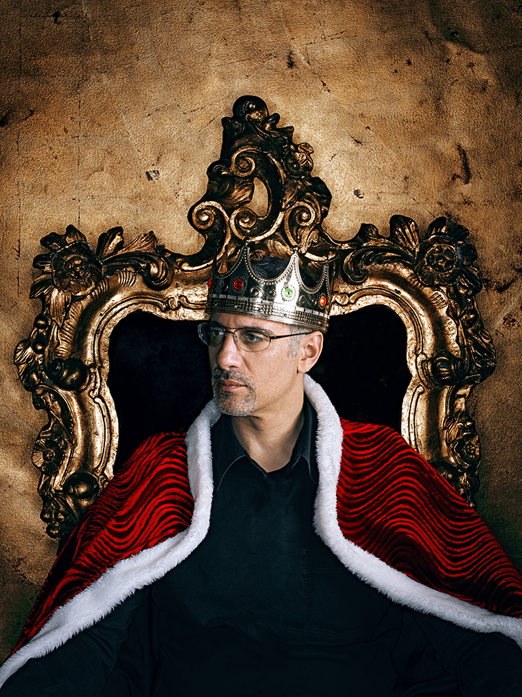 I needed to raise him up and get him into the scene, and that was gonna take a lot of gear! (And since this was a Barron’s gig, I only had one assistant) So Kaz and I showed up early…we got to Macy’s three hours before the shoot…and proceeded to turn the dining room into a photo studio for real. Besides my usual two tons of lighting gear, we hauled in apple boxes, saw horses, a sheet of plywood and a 4 x 8 piece of white plexiglass and went about rigging a platform that would raise him up to the right height…