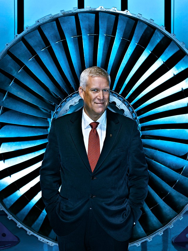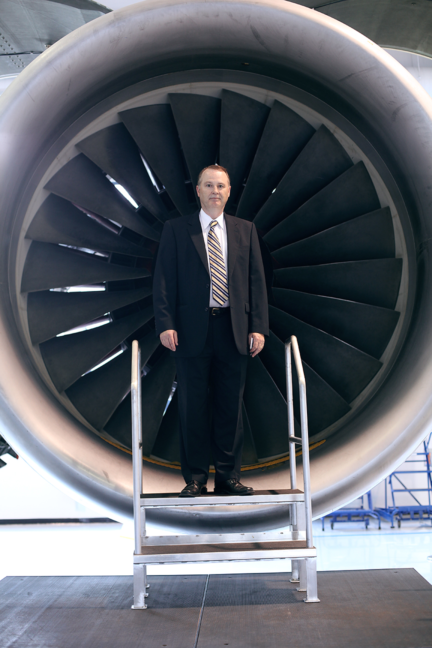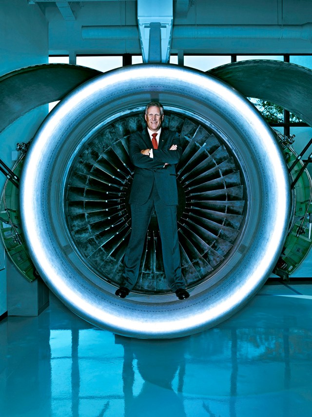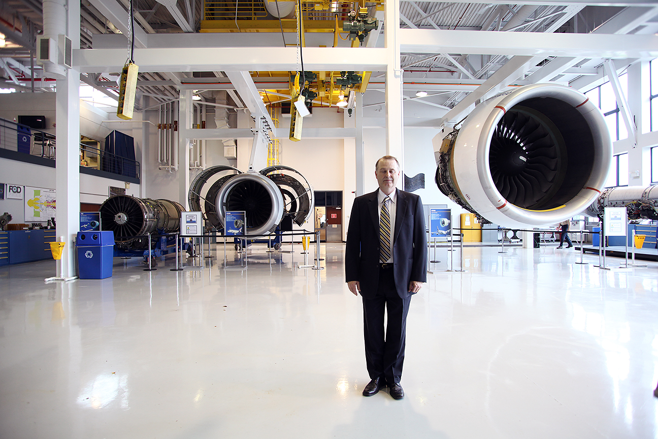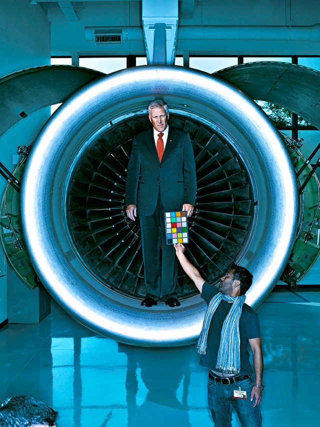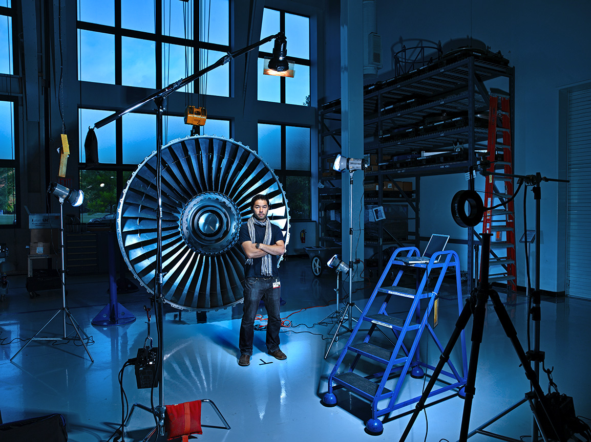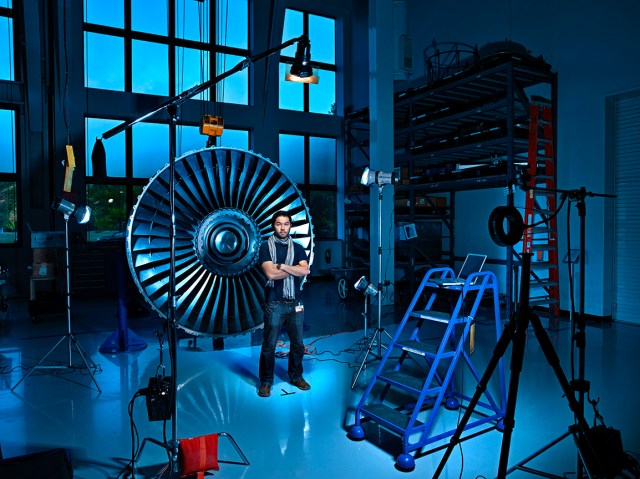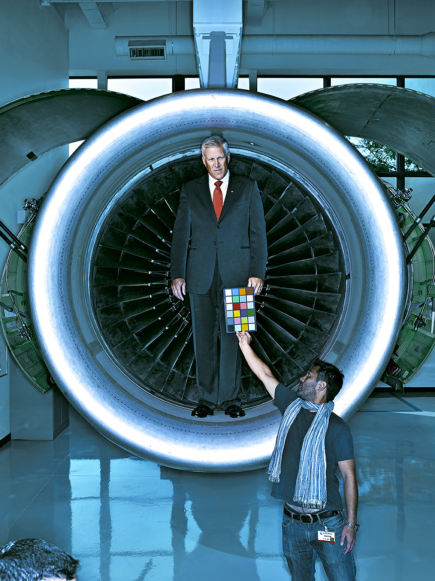 A couple of weeks ago, Adrian DeLucca at Barron’s asked if I wanted to shoot a cover story featuring Louis Chenevert, the CEO of United Technologies…the only problem was, United Technologies didn’t want to let Louis leave the office and go play with any of the cool toys UTC makes…like the really Big Jet Engines that I knew they had sitting at the Pratt & Whitney plant right across the river from their corporate headquarters in Hartford! But after a little back-n-forth with the folks in corporate communications at the company, I convinced them that since I had shot at UTC many times in the past and I knew the offices were Death on Toast…very functional, but not exciting in the least…a location scout was in order! And after only five minutes of poking around the Testing Facility Hanger, this was what I found…..