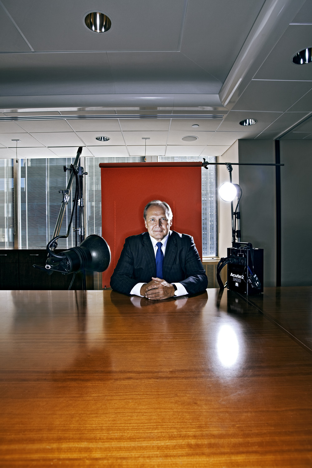 Just as last year, The Roundtable meeting was taking place at The Harvard Club, so our ‘studio’ was a room with walls covered in portraits of dead, rich white guys staring down at us. They were apparently ex-Presidents of Harvard, which is probably why they called it the Presidents Room. We quickly set up out cover set…a black velvet backdrop, the blue plywood posing table, and a pretty simple lighting setup of a 20″ Profoto White Beauty Dish main light, a second Profoto Beauty Dish as a blue moon-glowy hairlight (but this one is a Silver dish with a 20 degree grid and 2 Full Blue (CTB) filters attached) and a 4′ x 6′ Chimera for an overall fill behind the camera position…
