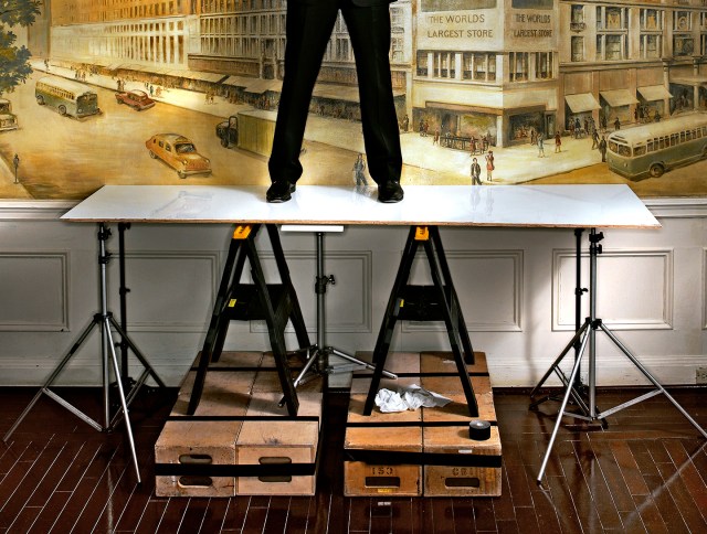 Because each person was to be shot separately and combined in post into the final group shot around the table, I needed a posing table that would give me the proper curve for them to lean into so that when I positioned each person, they would be sitting or standing at the correct angle and my Photoshop blending at our gigantic Earth Table wouldn’t look fake. For the posing stand, I simply cut a curved piece of plywood, painted it blue to match the color of the globe image and screwed it into some apple boxes. Once the basic physics of what angle and height to shoot the cover was planned out, we were ready to get down to business. Since we were scheduled to begin at 8:00AM Monday morning, we spent a leisurely Sunday afternoon setting up…