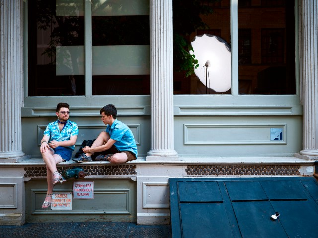 For the first time in years, the five guys who created a poster consisting of a pink triangle set against a black background with the words “Silence = Death” below it, would be together at the same time for a 30 year commemorative gathering at the Leslie-Lohman Museum of Gay and Lesbian Art. Because of the event, we weren’t going to have a lot of time to shoot, but I still had to come away with a group shot and individual portraits of each guy. And because of all the people attending the event, shooting a group photo inside the gallery would be impossible. We decided to use the outside of the building…