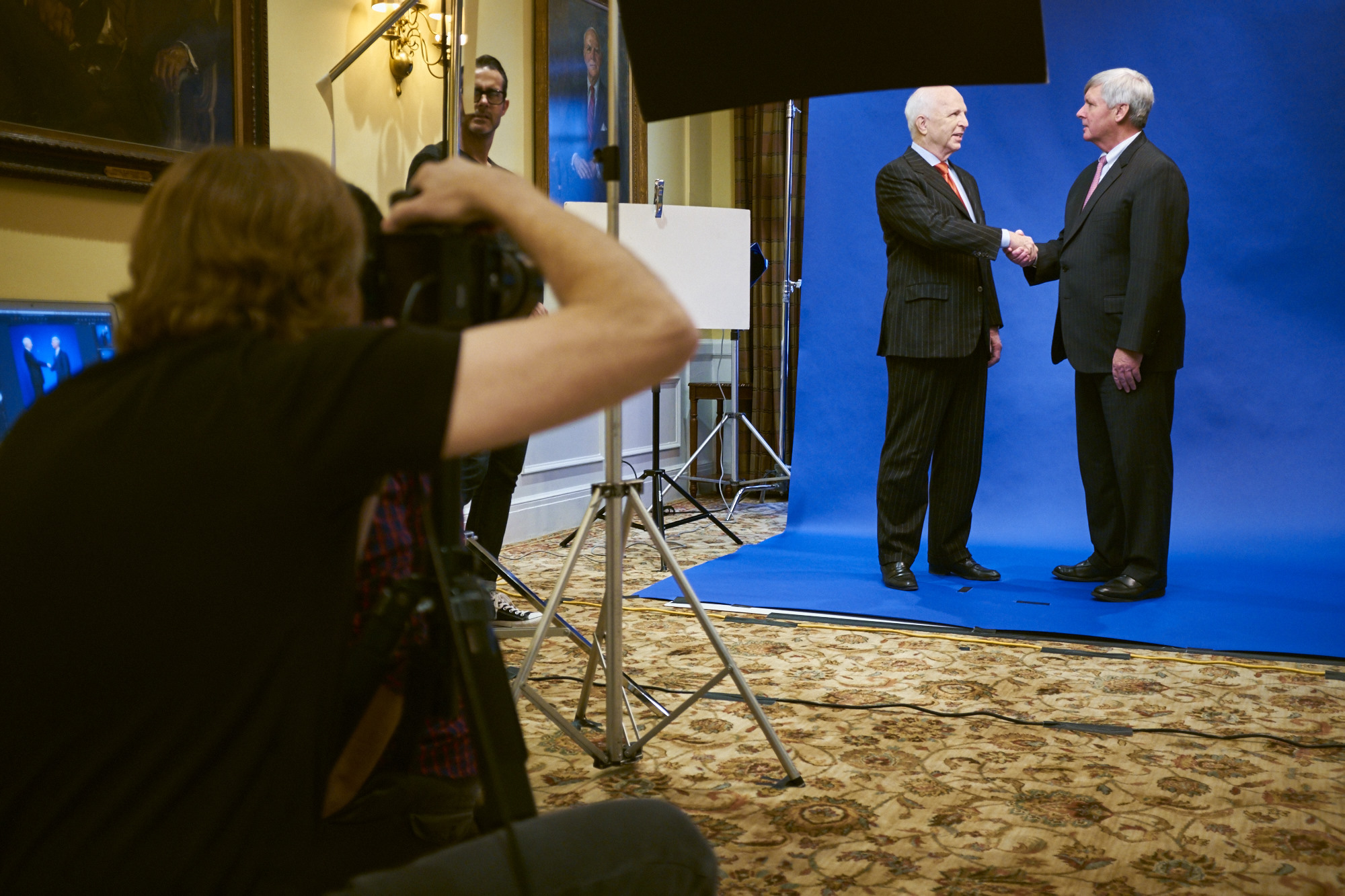 …but probably the hardest thing would be how we could quickly get each Roundtable member to understand exactly what the final image would be and how to get them into position. Remember…I have less than ten minutes with each person and I had to shoot two other setups besides this one! I figured the smartest way around this would be to show them a pretty detailed mockup of our cover ideas with one of my assistants standing in, so on our setup day, I had Robert work his magic…