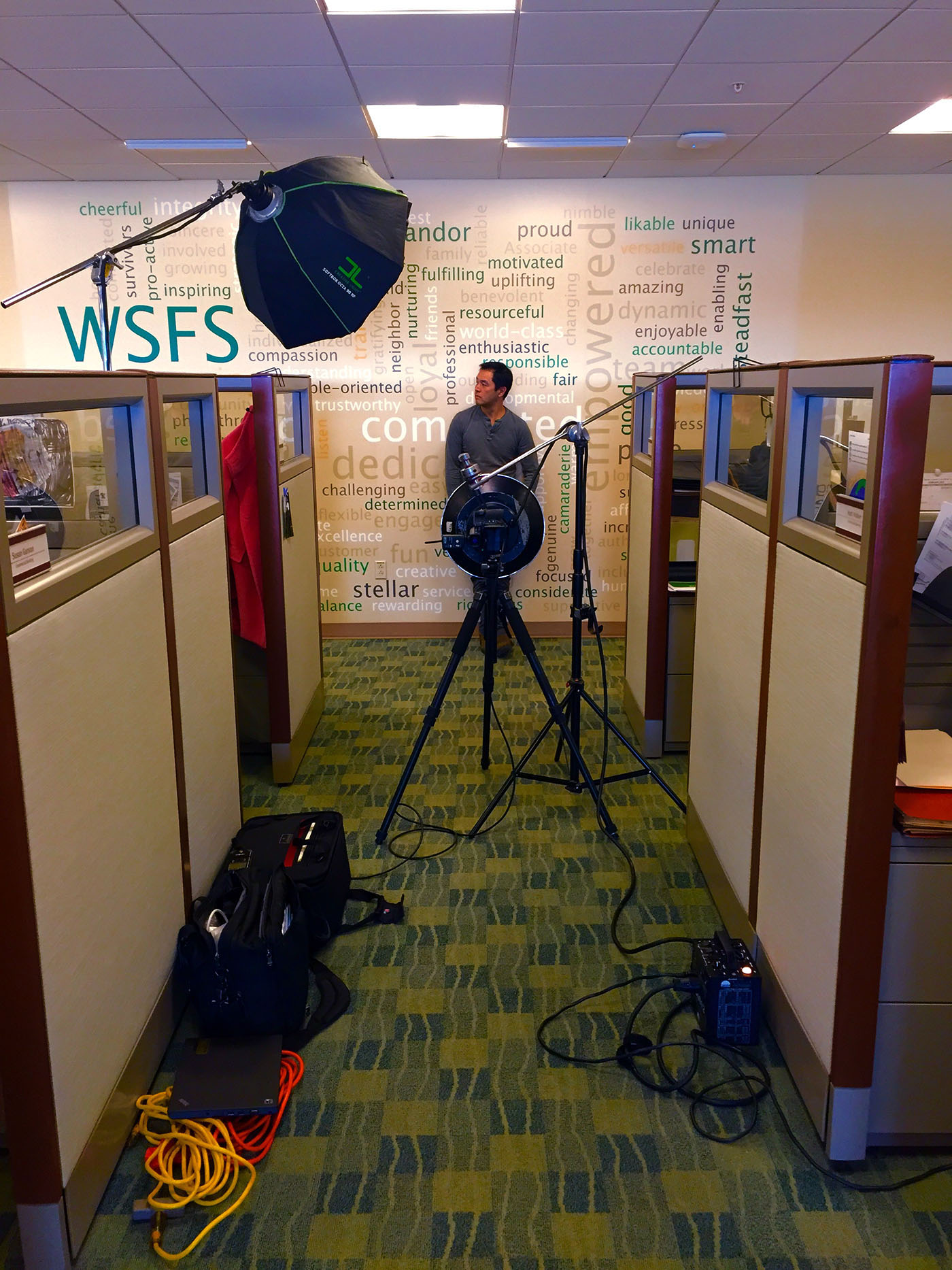 …and to mimic that soft wall of light from the windows, I decided to light the set with two 65″ white umbrellas plugged into 2000 w/s Elinchrom packs, set up 90 degrees to the camera (and almost 20 feet from the subject) for a split-light effect…