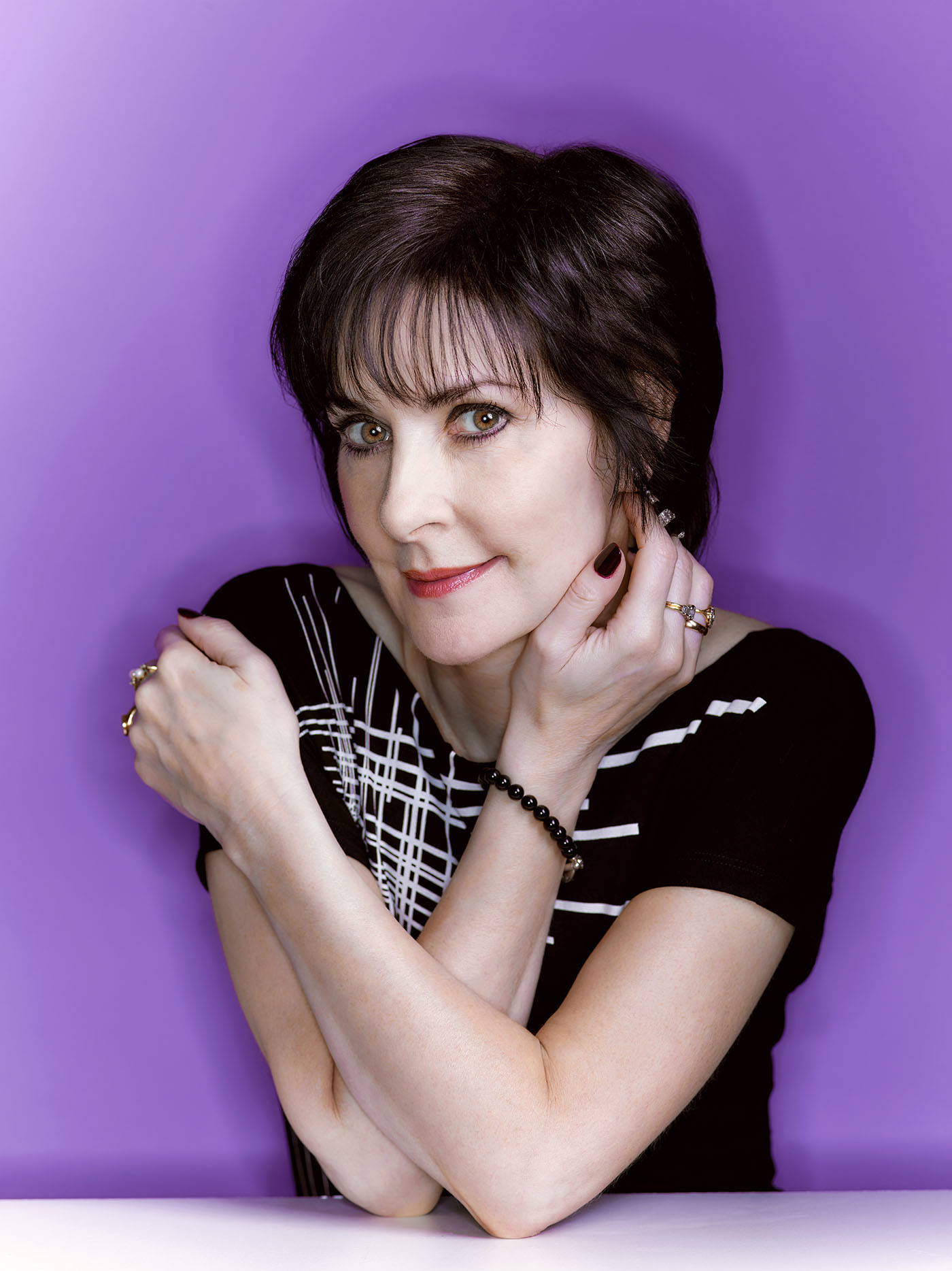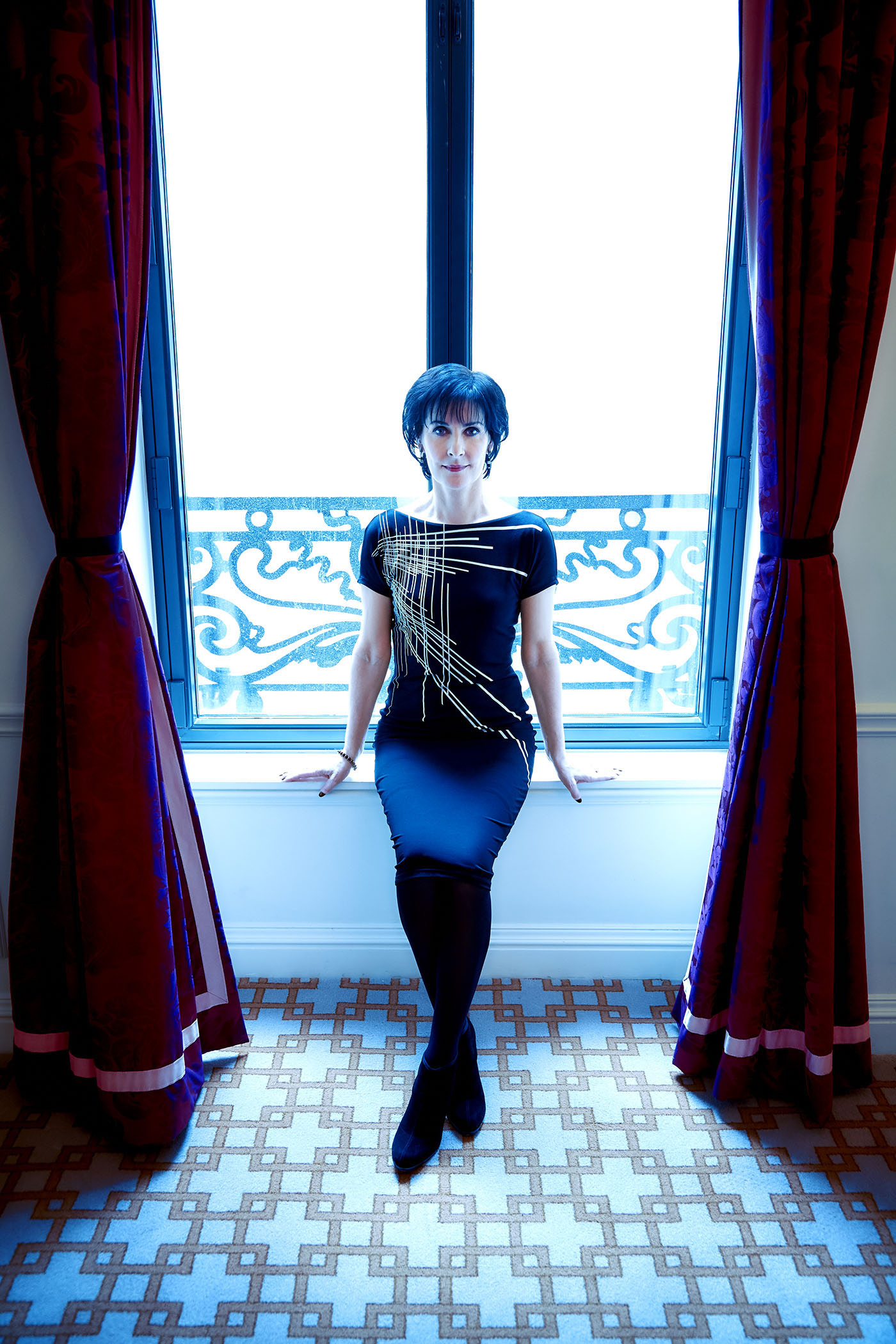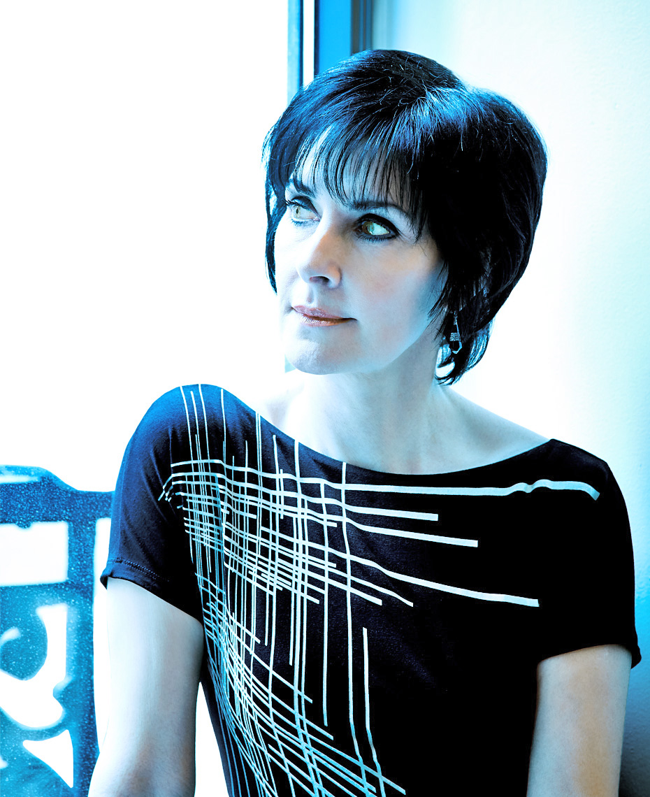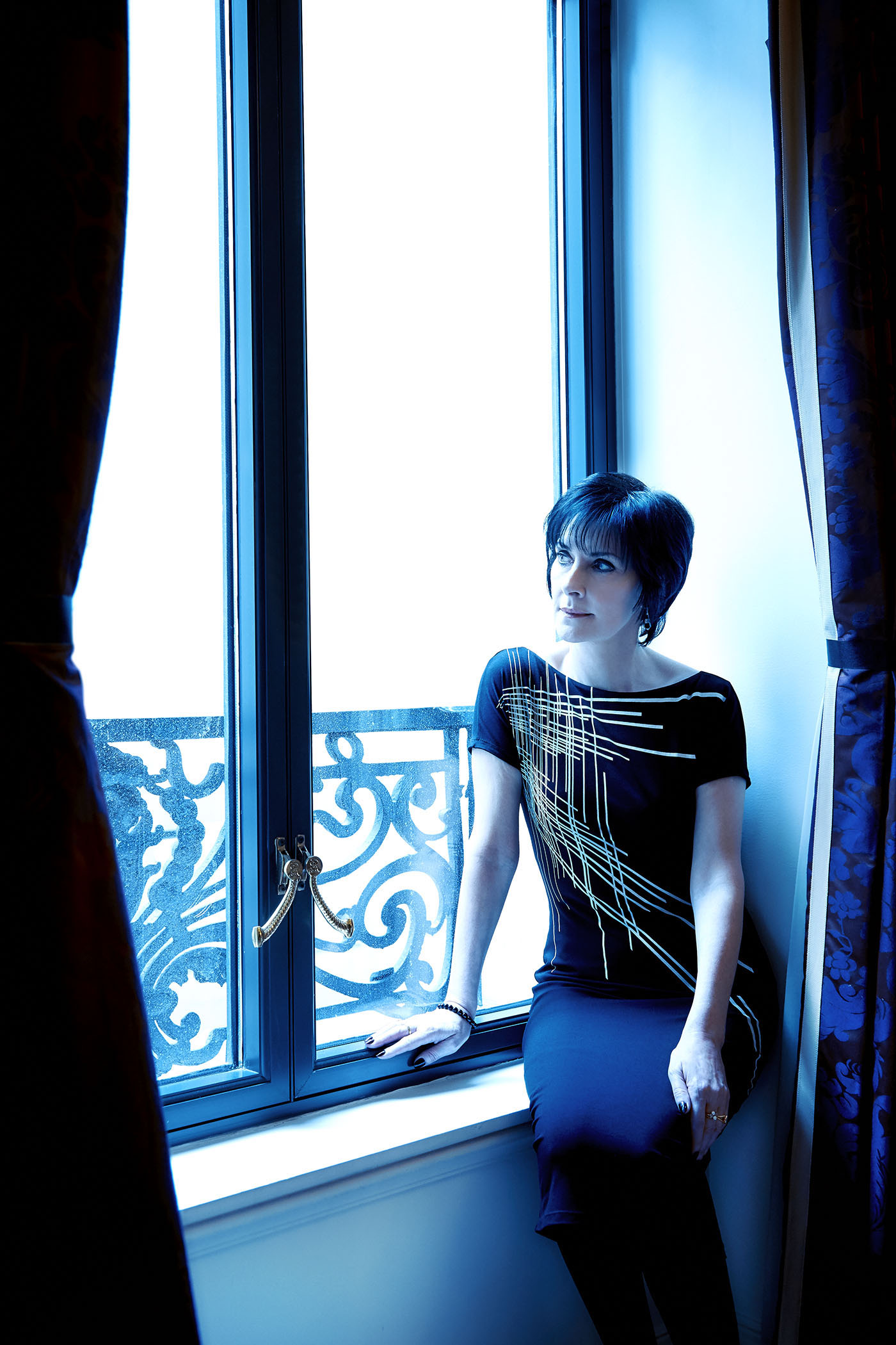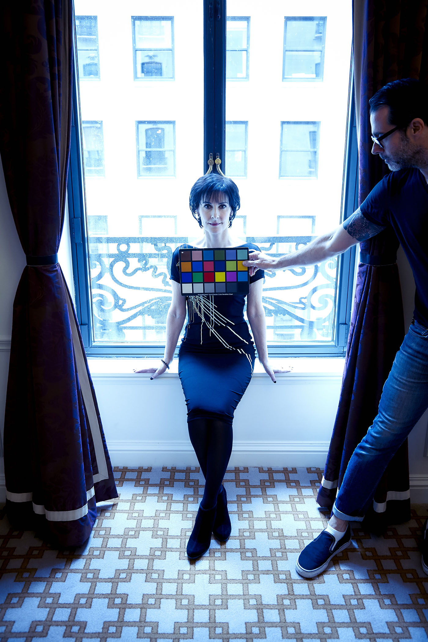 The lighting was super-simple…just a single Profoto 3′ RFI Octa bank way up high on a boom…and a couple of medium strip skim lights with blue gels to mimic the lighting from the background…