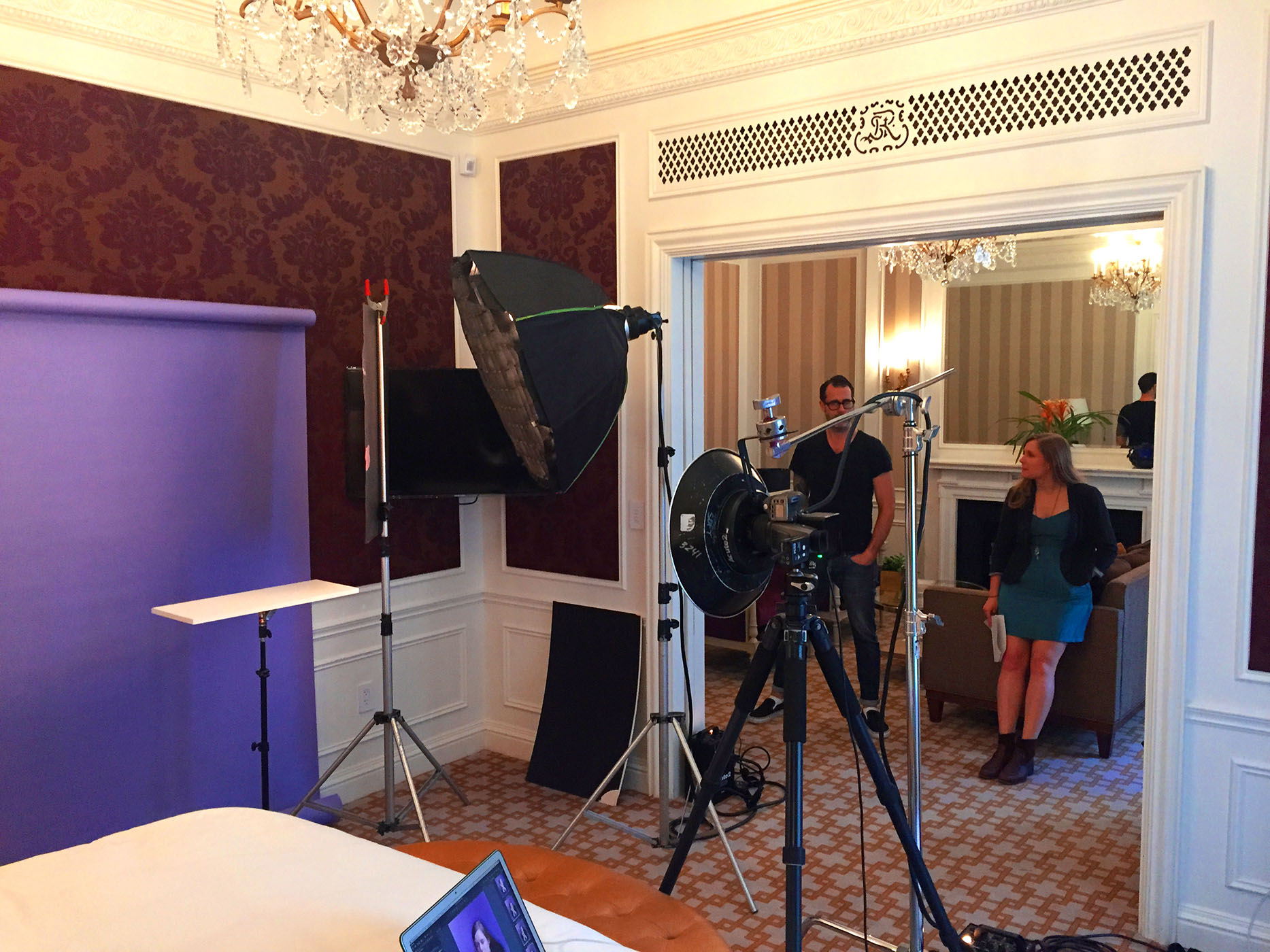 It didn’t really require much lighting…but I added a 6′ Chimera for an overall soft fill behind the camera, and positioned a gridded 3′ ProFoto RFI directly above the seat for our main light…