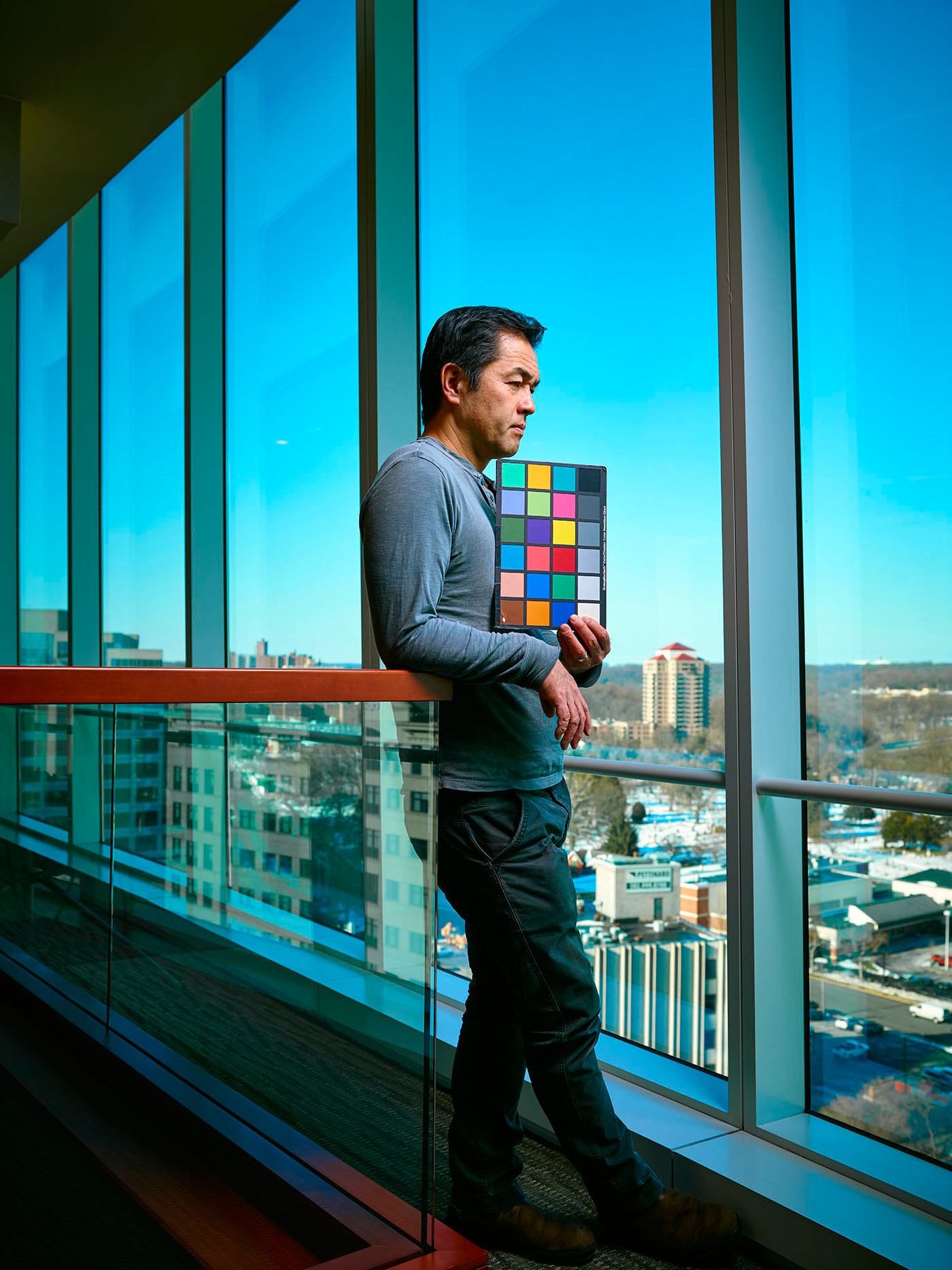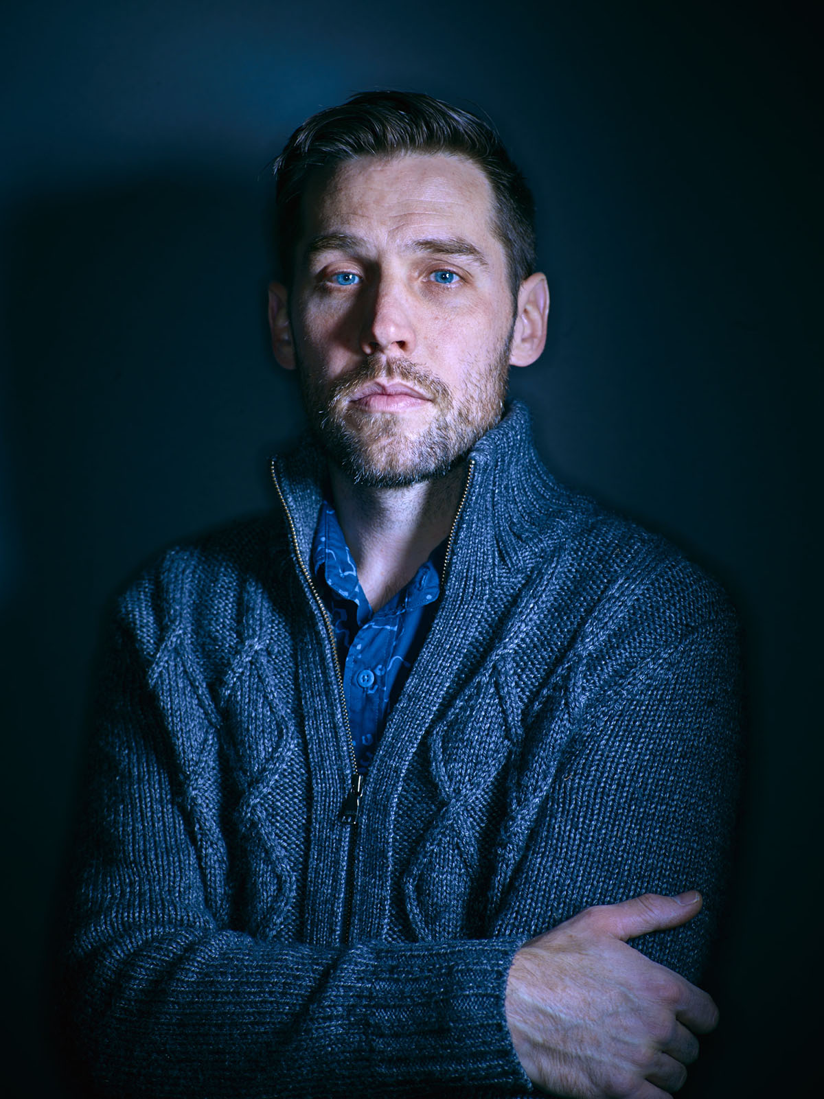 I did a lot of cross-filtering with CTO and CTB tells to add to the mood. The Ring Light and Mini Slave were both wrapped in blue, while the beauty dish had a full CTO to warm up his skin and the wall behind him. There was a huge wall of windows on the left side that also let a lot of cool, blue light in. My first test was kind of right on…