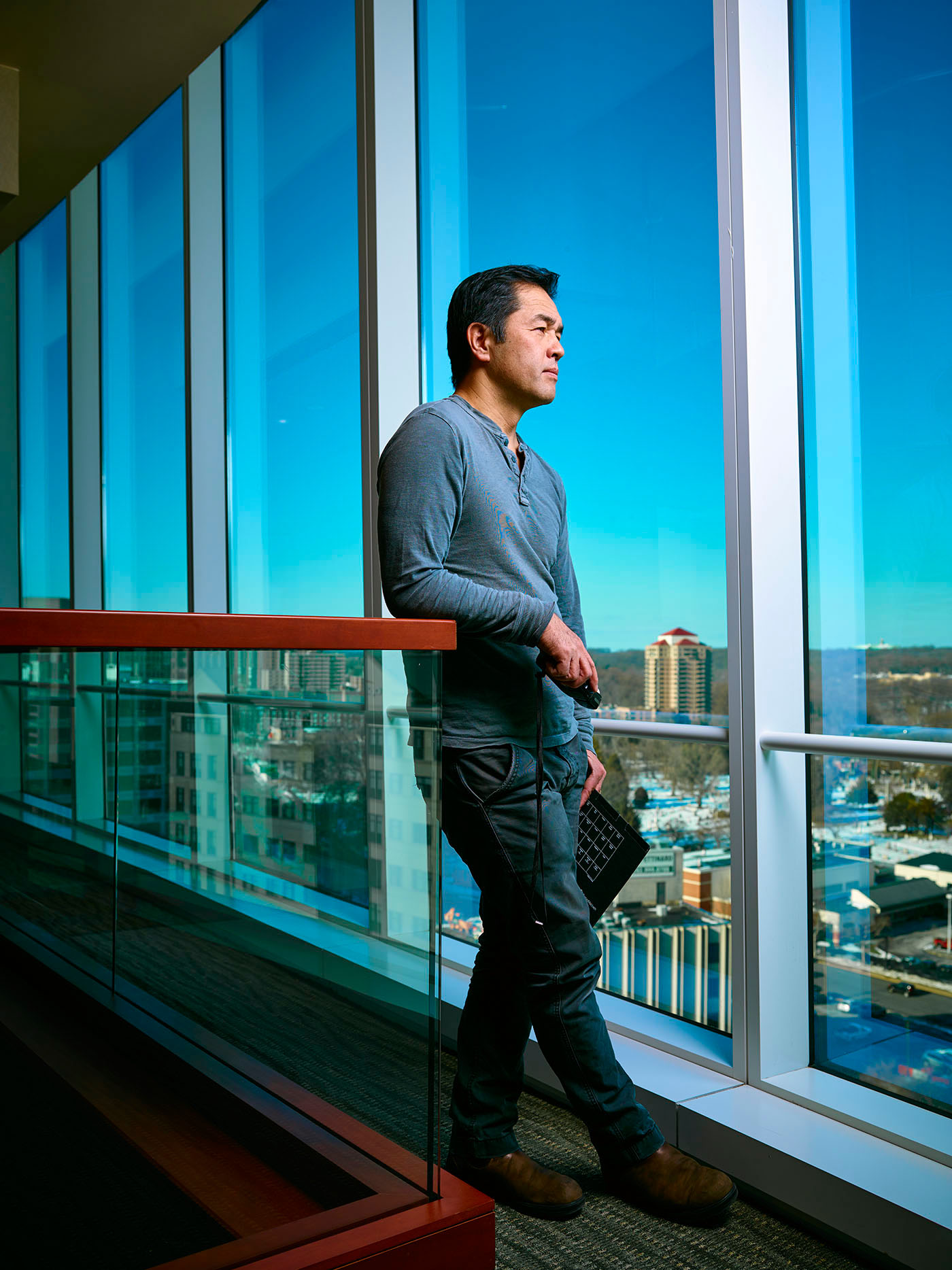 It doesn’t get any simpler than this…one big, soft light source (a 47″ Rime Lite Grand Box) placed on a boom stand about 2.5 feet above his head. No fill, no tricks. Here’s how it looked on Robert…