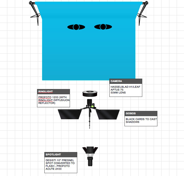 I positioned the Desisti directly behind and above my camera and cut the light with two cards on either side that gave me a exact slash of light I wanted. A little pop from the ringlight filled in the shadows just enough without throwing a ringlight-effect shadow…