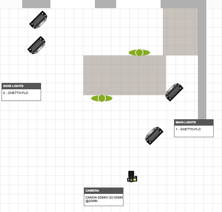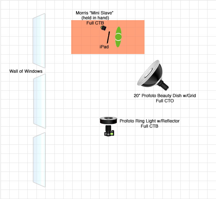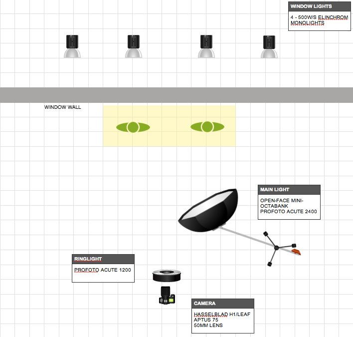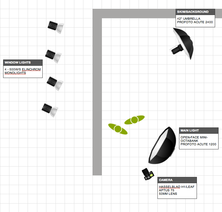 You can see that we used four heads just to cover the frosted glass, and another big umbrella to fill in the background on the far right side. With all that light bouncing around, all we need up front was the Mini-Octa bank positioned high and to the right and we were good to go…