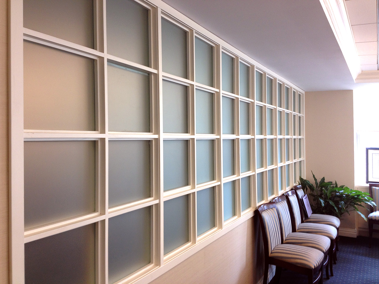 I figured that if we backlit the frosted glass wall and used just the right wide angle lens, that grid pattern would make for a nice, graphic background. But that big wall of glass took a lotta light before it blew out nicely!