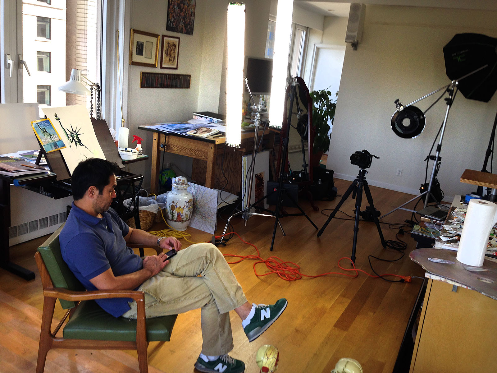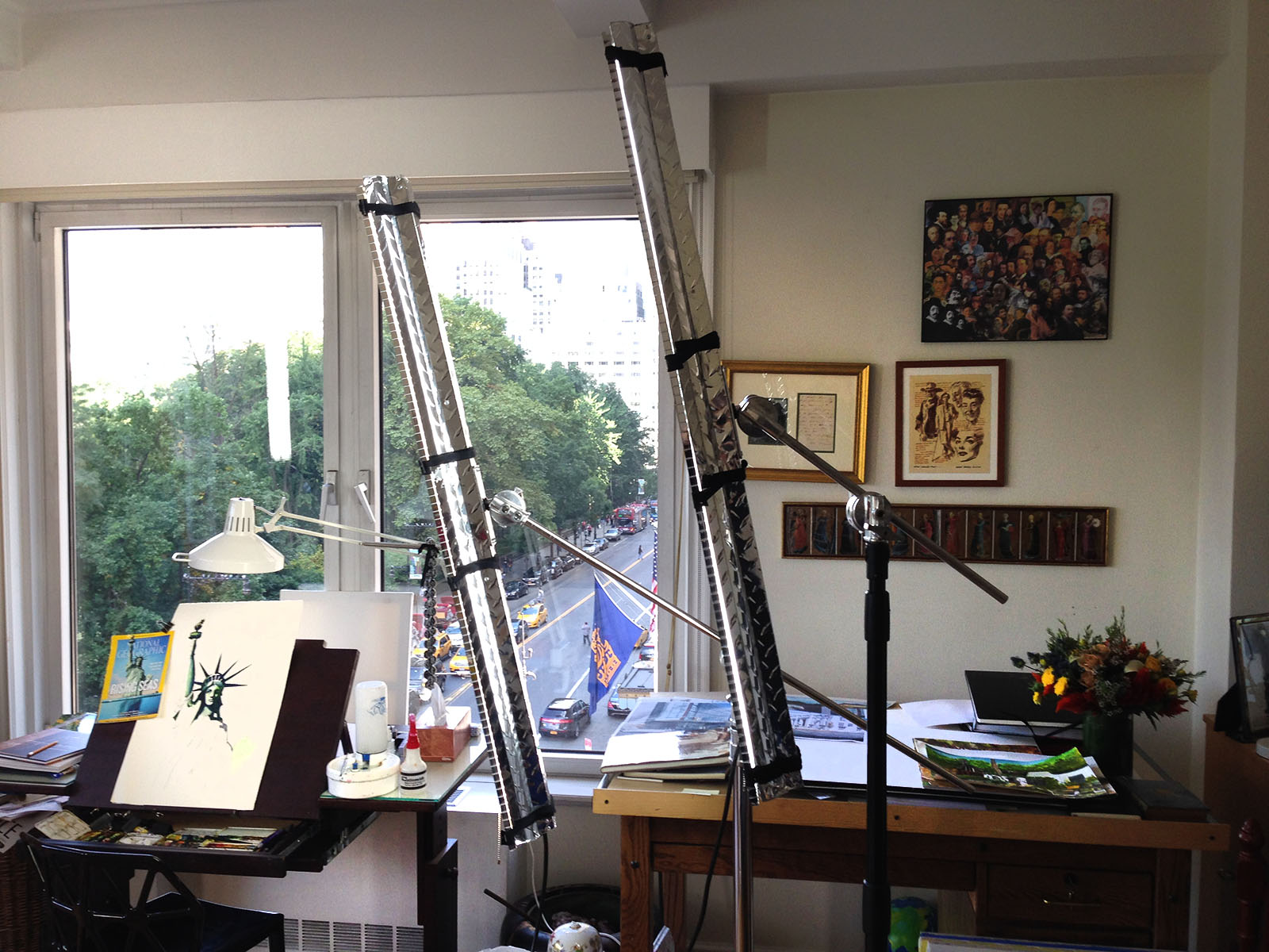 The big wall of windows next to the easel face North onto Central Park and the east-facing windows would act as a nice fill, but I would still have to pull out my DIY Ghetto-Flo’s to to act as a main light, while still keeping the natural look of the scene. I didn’t need too much front light…two of the Ghetto’s should do it…