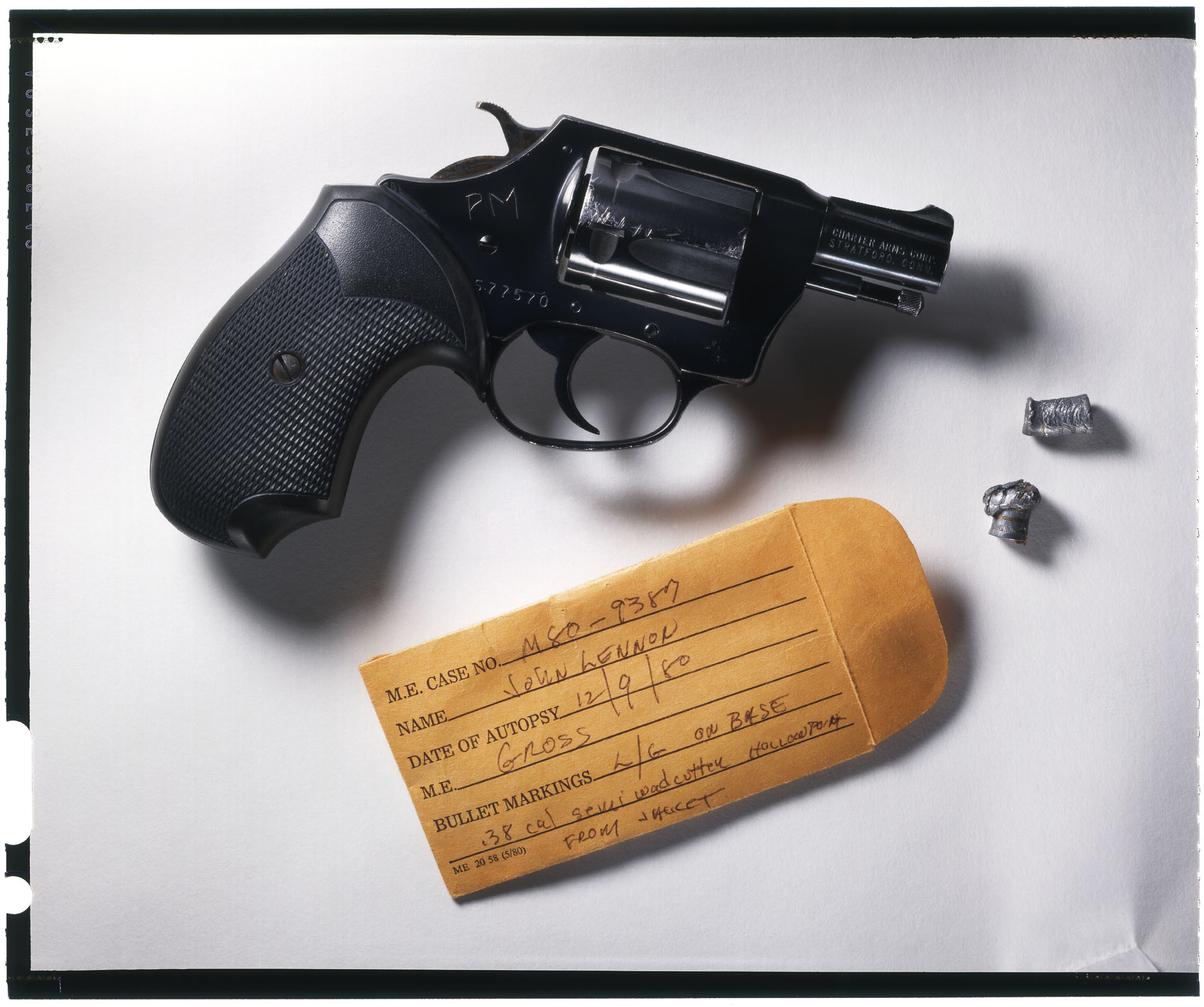 For a lot of reasons, I found that assignment incredibly depressing, but especially photographing the Lennon gun. I don’t know too many people of my age who weren’t deeply affected by John Lennon’s murder and the idea of holding the gun that killed him was not exactly one of those things anybody would ever think possible. But when I arrived at the New York City Police Department Ballistics Lab…in one of those typically dreary looking NYC Police buildings…I was surprised at how nonchalant the attitude was about me photographing the gun. I was led to a small, dark room with a metal table and a couple of chairs. It had the look and feel of every interrogation room from every cop movie you’ve ever seen. Shortly afterwards an officer came in and simply handed me a plain brown envelope and told me to just let him know when I was done. Then he left. I opened the envelope to see the gun, but there was also a smaller evidence envelope inside. It contained two .38 caliber slugs that were found during the autopsy. Both had passed through Lennon and were found trapped in his jacket. And both had bits of flesh embedded in the jagged tears of the deformed lead. It brought tears to my eyes. I just wanted the job to be over. I set up my lights, shot maybe ten sheets of film, and got the Hell out of there.