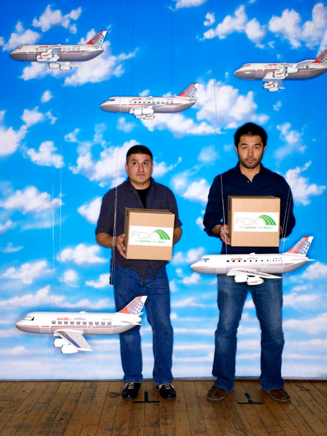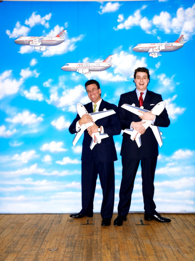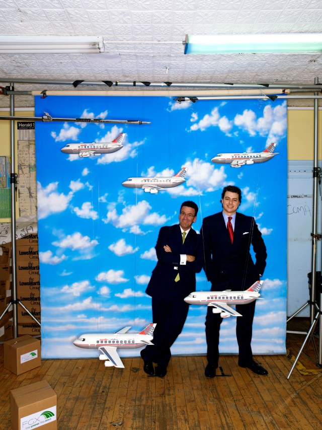 BusinessWeek SmallBiz hired me to shoot the founders of First Global Shipping…a kind of international messenger service that operates like FedEx, but uses commercial airlines to move their packages. FGX lives up to what SmallBiz is all about…it’s a very small business! When I checked the place out on a scout, I found that they operate their entire operation out of a small, unadorned loft in Chelsea. Nothing glitzy, fancy or even remotely interesting in terms of a photographic setting…so I had to come up with something a bit more showy. I convinced Kathy Moore, my photo editor, that I could pull off a bit of fun, but she would hafta open up the purse…I needed a backdrop and a bunch of airplanes!