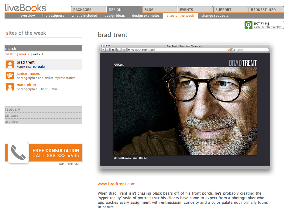 This is the third website design I’ve put up and by far the best. Quite honestly, the format of this site is exactly what I would have wanted years ago, but the technology just wasn’t there. Until now I’ve been using a Livebooks design, but this time I worked with Rob Haggart’s web design company, ‘A Photo Folio’ to implement the changes and we went live over the weekend. While everything about the architecture of the site is new, I incorporated a lot of the basic design elements from my previous site in this new project.
